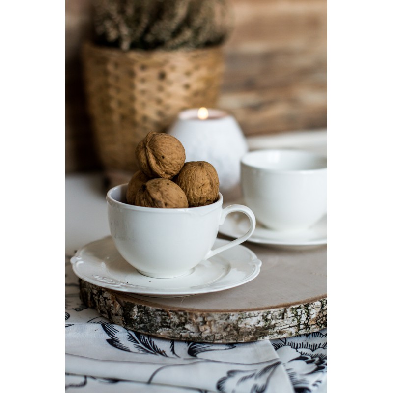 Set 2 cesti si farfurioare incluse in seria LUXURY. Tacamurile sunt realizate din portelan alb durabil si de inalta calitate. Forma rotunda universala, decorata cu un motiv delicat de crengi in relief este eleganta in sine. Clasice similare cu formele de moda veche in acelasi timp, se potrivesc perfect cu designul modern si se armonizeaza perfect cu acesta.